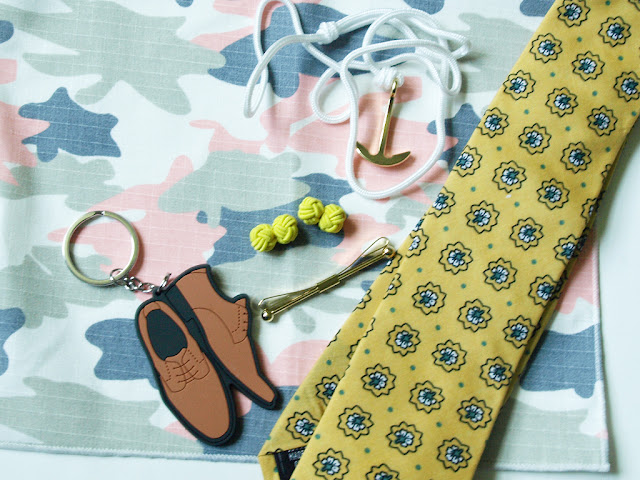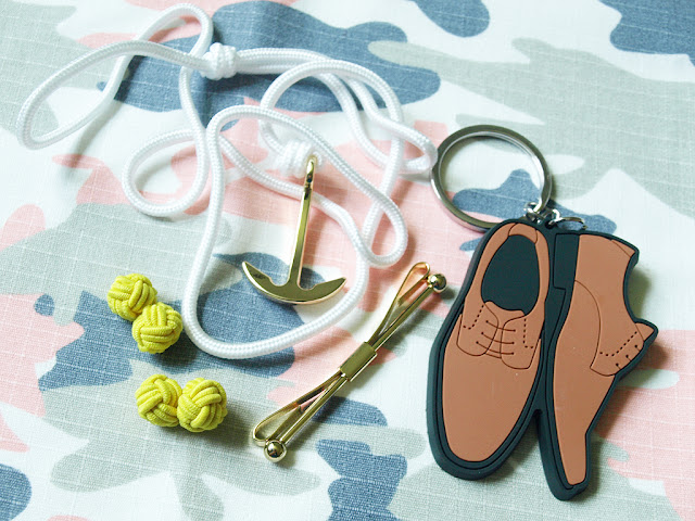 The July pack had an anchor bracelet, a tie clip, a keychain made of a rubber/silicone type material, and yellow knotted cufflinks. Like I said, the theme is a little lost on me this month but individually these accessories are all high quality. I especially like the anchor bracelet.