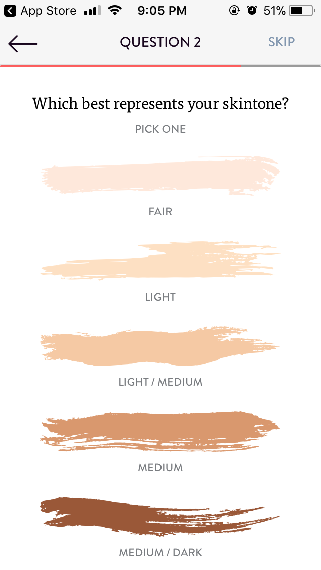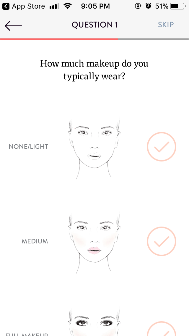 When you first download MiaMia you’ll create your account. You can sign up through email, Facebook, or Instagram. Then you’ll fill out a short four question survey (see screenshots above) so MiaMia can learn a bit more about your skincare and makeup needs and preferences.