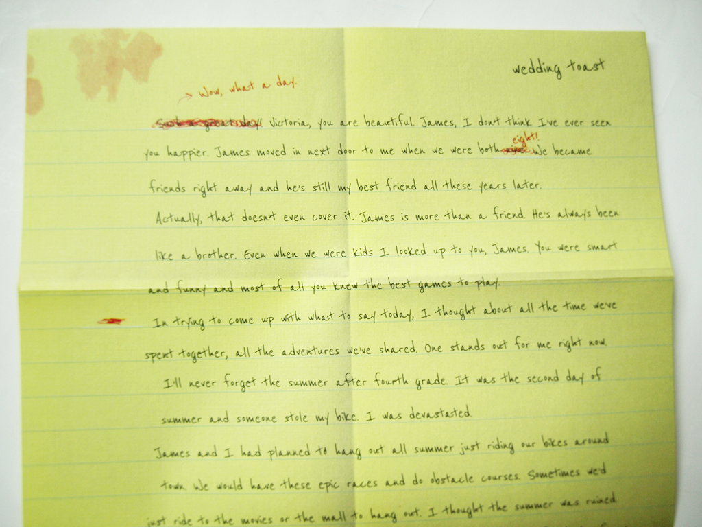 I just love the attention to detail on all of the clues; it’s easy to see that a lot of thought went into planning out this box and story. Even the red ink and corrections in the best man speech (yellow paper) add to the authenticity!