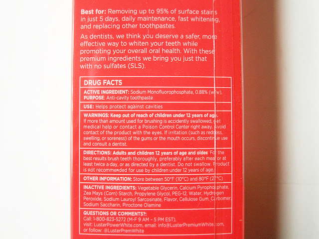You can see all of the ingredients and directions above. I appreciate that the toothpaste was formulated by dentists, since that gives me more confidence that it will work and not aggravate my tooth sensitivity.