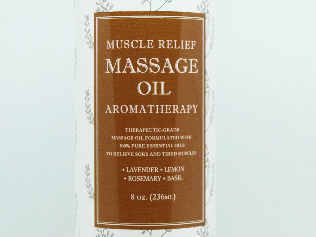 The Muscle Relief Massage Oil is made with six simple ingredients: sweet almond oil, jojoba oil, lavender oil, lemon oil, basil oil, and rosemary oil.