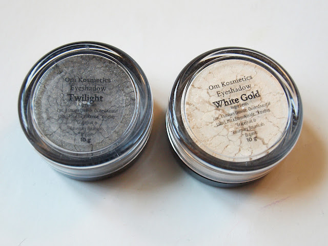 The Mineral Eyeshadow is available in 11 shades. OM Kosmetics also has a vegan primer and eye makeup remover. I received Twilight and White Gold to try.