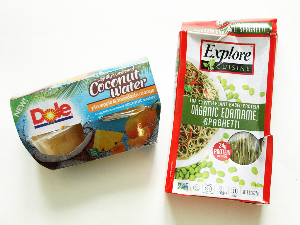- Explore Cuisine Organic Edamame Spaghetti ($4.99) – This pasta is made with organic edamame beans, making it gluten-free. It’s also kosher and non-GMO. Even though the fruit cups leaked on it, the noodles are inside plastic packaging so only the box got a little wet.
