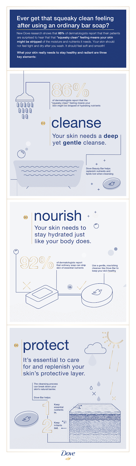 While it may seem like being squeaky clean is the ideal, it’s actually not great for your skin. Dove has unveiled new research that showed 85% of dermatologists reported that their patients were surprised to hear that the squeaky clean feeling means that your skin might be stripped of essential hydrating nutrients. 92% of dermatologists reported that ordinary soap can overly strip the skin, so if you’re doing this multiple times a day that can lead to some irritated and painful skin!