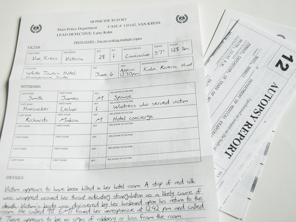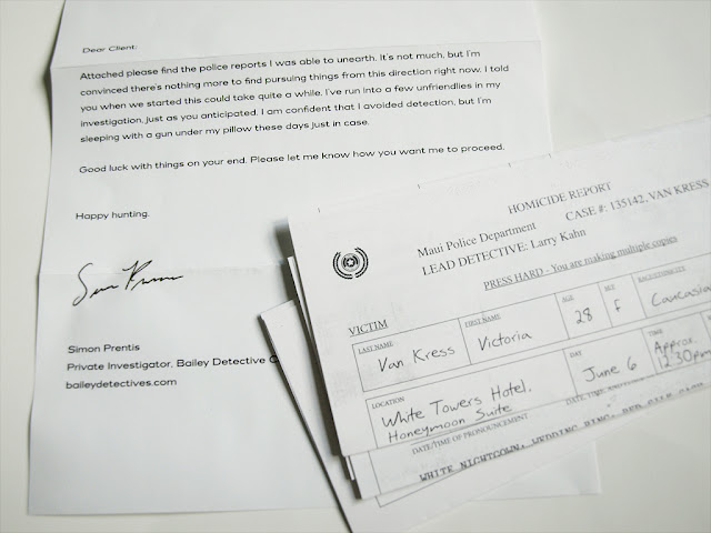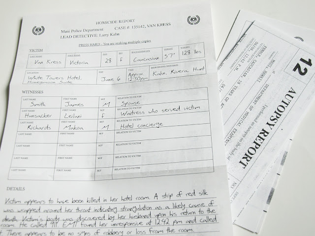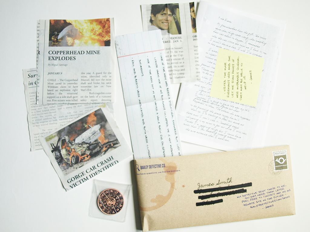 There was also an envelope from the Bailey Detective Company with a bunch of police reports inside. If you ever get stuck with any of the clues, the first box contained a link to the detective’s website at which you can enter a question to receive some help.