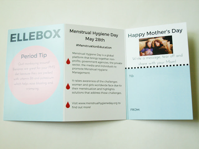 There’s a nice foldout info card that lists everything in your box, plus period tips and other information. This month’s card has information about Menstrual Hygiene Day on May 28th. I like this added information, because although I was lucky enough to have a lot of resources available when I got my first period, not all girls and women have access to this and the box is an easy way to share valuable information.