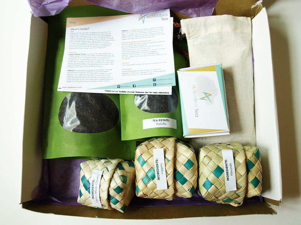 Alakaban Tea is based in Burnaby, British Columbia, Canada and all of their tea and spices are entirely organic and purchased from farms in Sri Lanka. Each box contains tea directly from an estate in Sri Lanka, as well as carefully paired spices, handcrafted tea tools, and five flavor pourches.