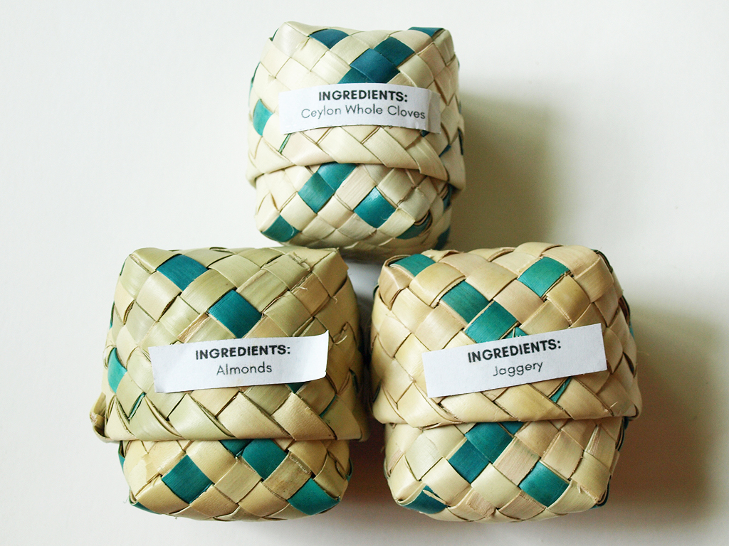 The spices come in three woven baskets. They’re so cute and reusable for other spices once you use all of these up. The box contained Ceylon whole cloves, almonds, and jaggery. Jaggery is a traditional cane sugar that smells similar to brown sugar.