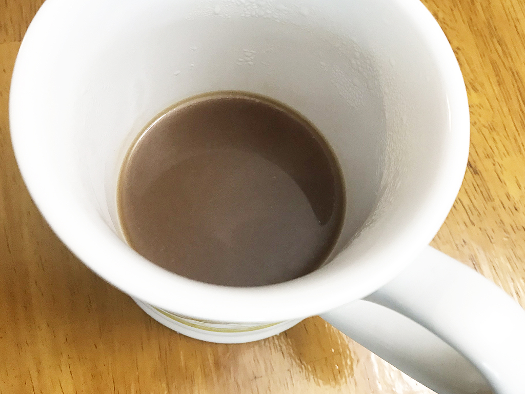I used the biggest, widest-brimmed mug I have because I was nervous that I would spill the tea everywhere when I tried to strain it. Luckily I avoided spilling, but that’s why it looks like there’s hardly any tea in the mug. Well, I guess there is hardly any tea. The recipe only called for one cup of water, so I think next time I’d do two or three cups plus equal parts teaspoon of tea.