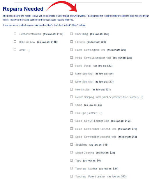 If you have a pair of shoes that are a little worse for wear, there are two easy ways to begin your order with Cobbler Concierge: you can order online at their website or via text message. I used their online ordering to start my repairs. All you have to do is fill out a survey with information about your repair, and then you’ll get an estimate of how much the repairs will cost. You won’t be charged until you agree to the proposed repairs.