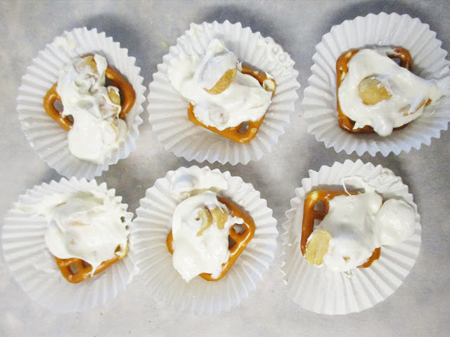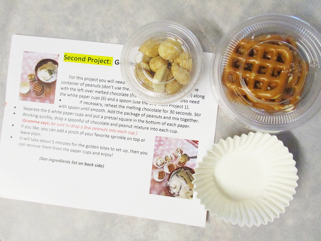 The second craft was Golden Bites. I love these! They’re going to be my new easy dessert to make for any potlucks in the future. There were enough supplies for six cups, and all you had to do was layer a pretzel, chocolate, and peanuts in the little paper cups. They’re the perfect mix of salty and sweet.