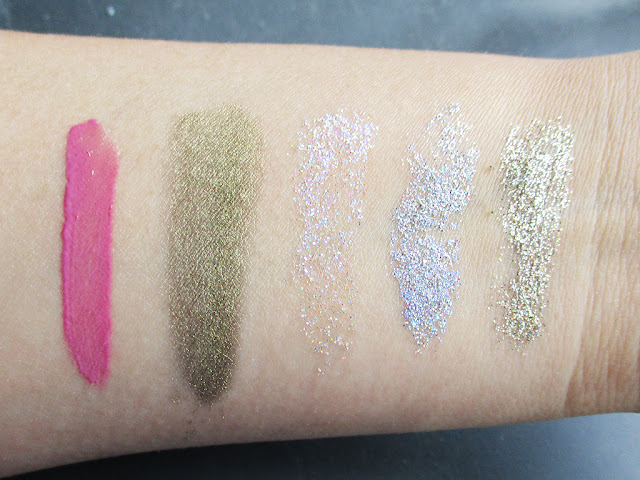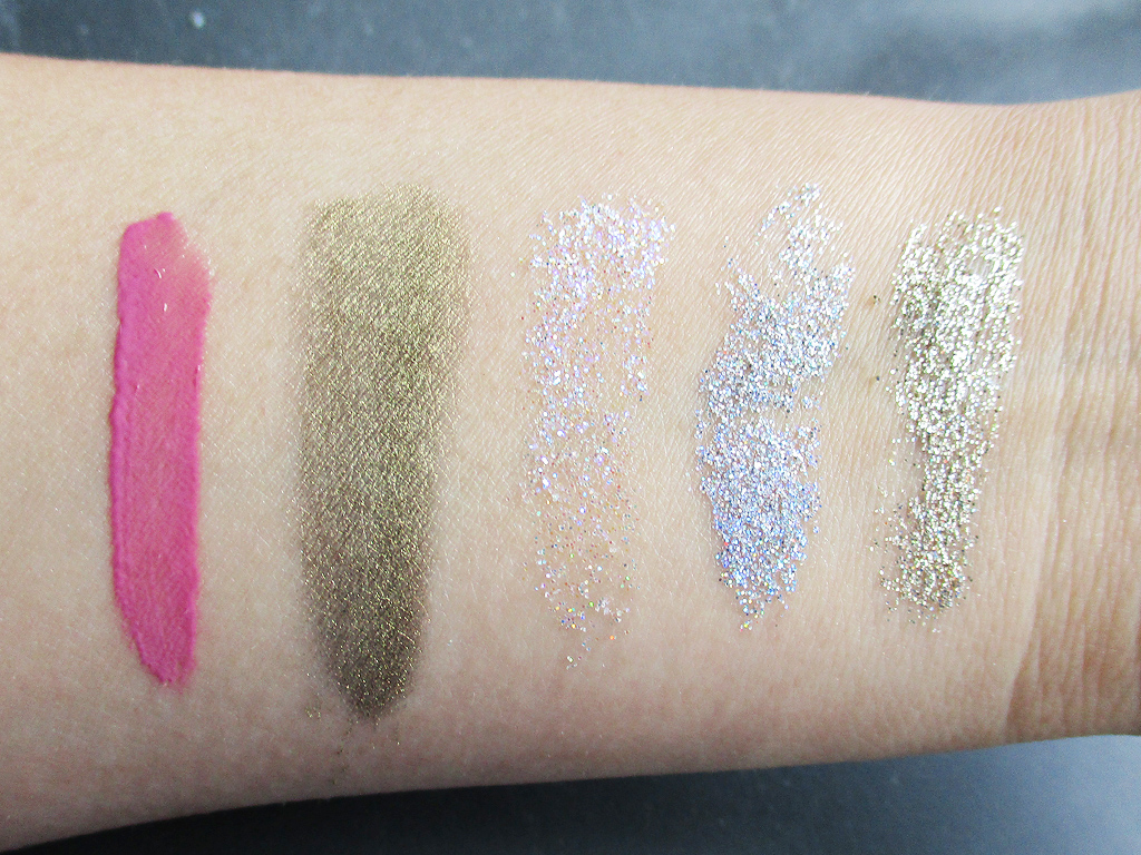 Here are the swatches for the Glosstone Pro lip gloss, Precious Gem Powder, and ECHO Pressed Glitter Palette.