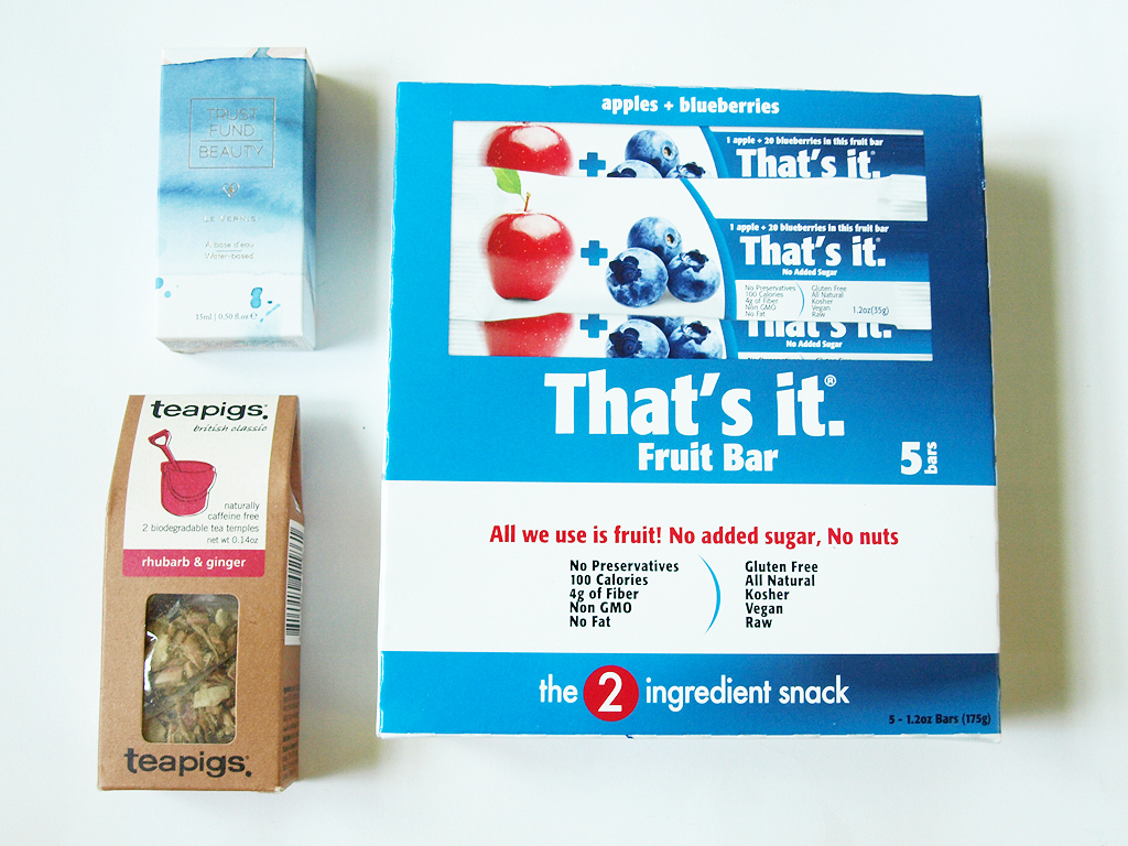 - That’s It Apple and Blueberries Fruit Bar – I’ve had these bars before and they’re very good, and Daily Goodie Box featured a full-sized box with five bars. The name is self explanatory: the bars are made with only apples and blueberries, with no preservatives, juices, concentrates, or purees. They’re an easy way to get a serving of fruit on-the-go.