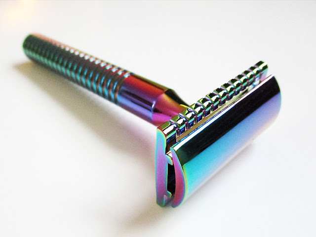 - Anodized Safety Razor ($29.99) – Ooh, shiny! I love the colors of this razor (see photo below for a close-up). It’s well-made and has good heft, which is essential for a good wet shave. The way it works is you load in the razor blade yourself and instead of pressing down to shave, you glide the razor and let the weight of it do the work for you. It actually makes for a much easier shave in my opinion, once you get the hang of it.