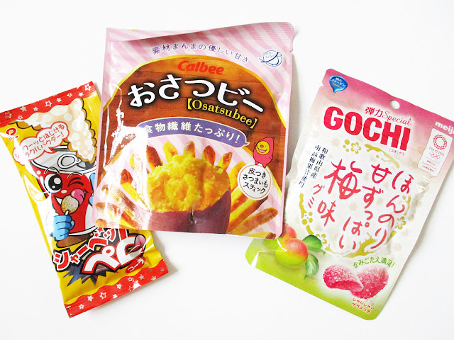 - Coris Plum Chewy Candy: When I first bit into these I thought they were chewing gum based on the texture, but they proceeded to kind of melt in my mouth as I chewed. They had a light plum flavor and powdery texture.