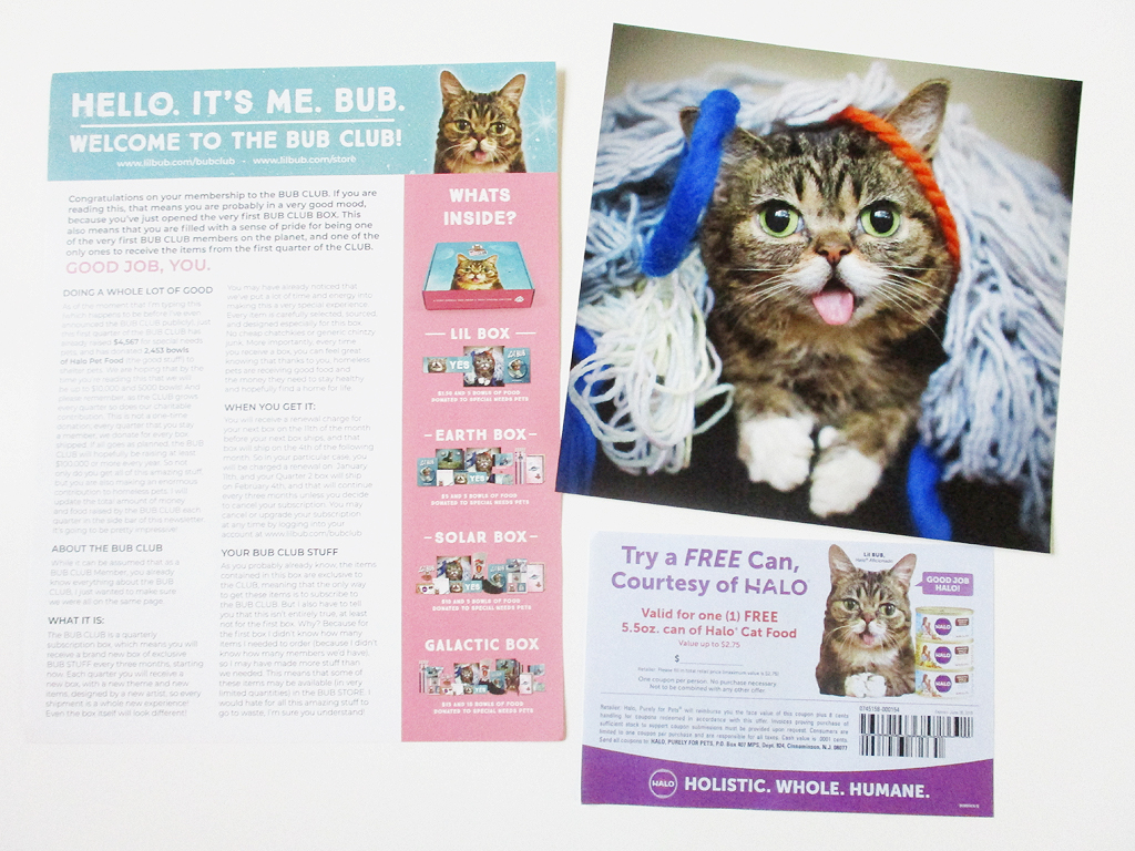 There was a full page sheet with information about Lil BUB, the box, and all of the items and creators inside. The first quarter of The BUB CLUB has already raised $4,567 for pets in need and donated 2,453 bowls of Halo Pet Food! I love that this box not only gives me adorable BUB items but also helps animals in need. Here’s everything that was inside: