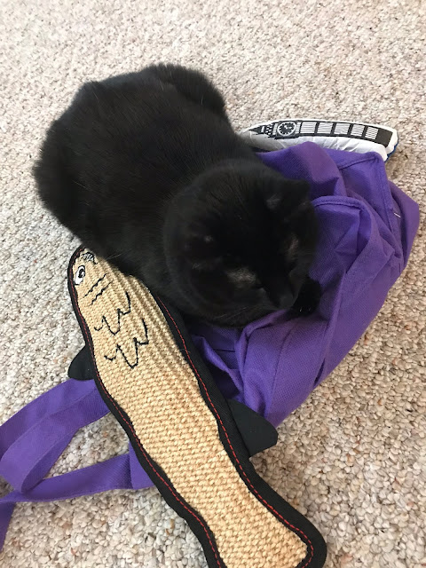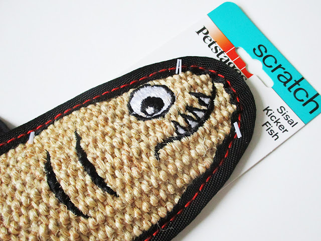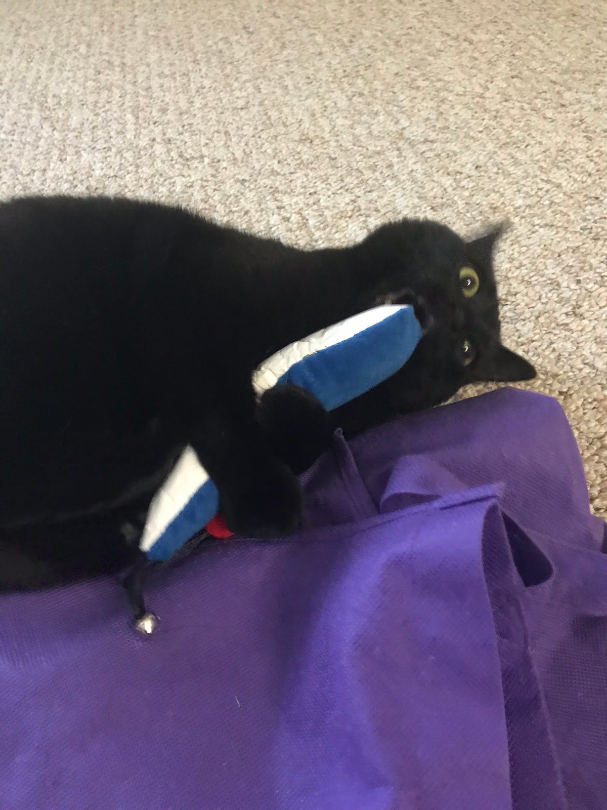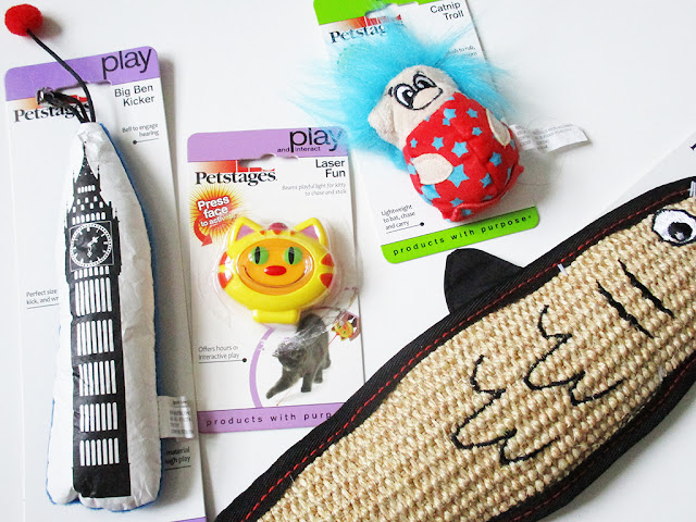 Two of the toys were kickers (the Big Ben and big fish), which are Tully’s favorite. She immediately took to the Big Ben toy but still isn’t sure about the fish. I wish I could get her to scratch it instead of my couch! The other toys are a cat face laser pointer (another favorite) and a catnip troll. Tully doesn’t respond to catnip but she’ll still have fun batting the troll around.