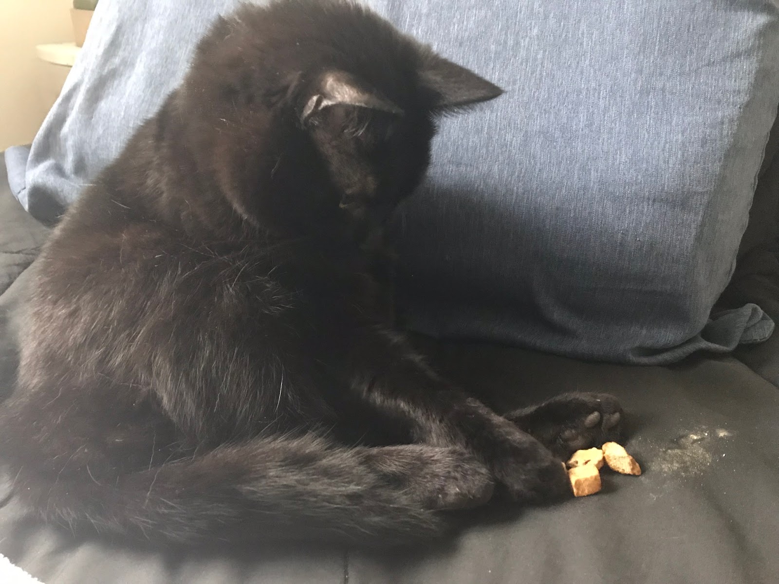 Tully inspecting the duck treats. The dust is just from the treats, I promise my bed isn’t actually that dirty!