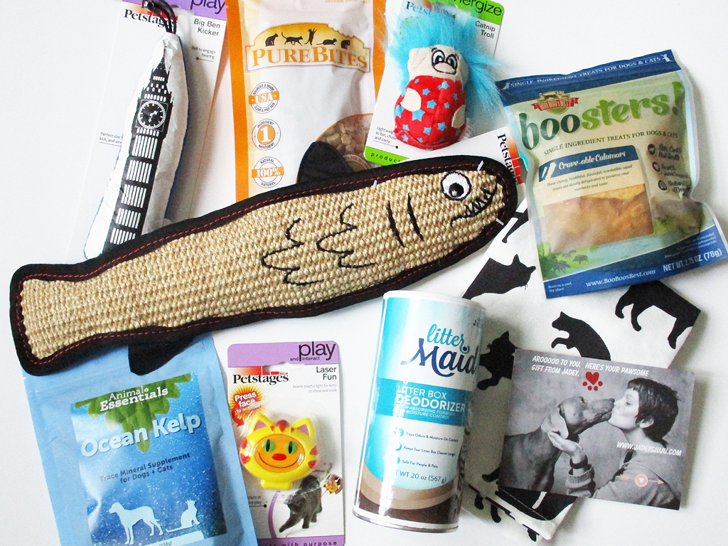This is a review for the quarterly cat box, which comes with two to three superior treats, two to three high end toys, a litter box product (such as odor eliminator), one high end supplement (such as a probiotic), one surprise for a cat loving human, a random and well thought out kitty-specific surprise/product/treat, and an entry in the bucket for an extra special biannual gift! All of the items are handpicked by the Jadey’s JuJu team to ensure quality and are ethically sourced. Product ingredients are listed on the treat bags and on the manufacturer’s websites. The Jadey’s crew is experienced with foods/supplements/treats that could trigger allergy issues so they work hard to pack your box with the most “pawsome” selection!