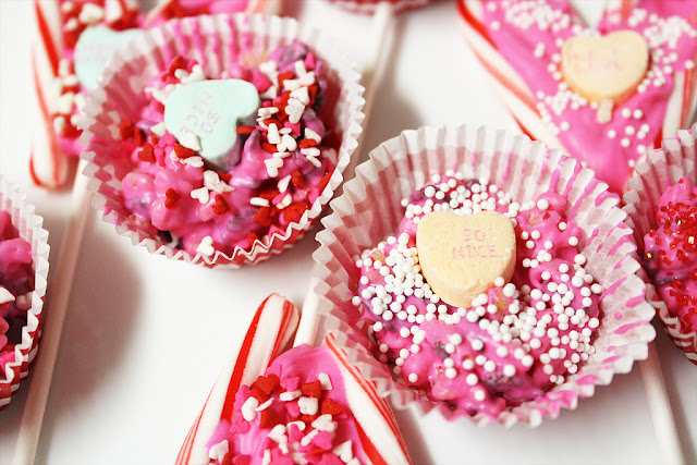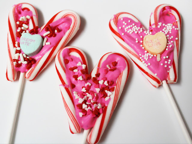 The first craft was Valentine Candy Cane Hearts. I love how creative these crafts are! To make, I melted the included chocolate and then spread it in between two mini candy canes and a stick to make it into a lollypop. There were also lots of sprinkles and conversation hearts to decorate the hearts with.