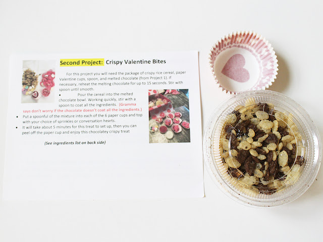 The second craft was Crispy Valentine Bites and it included the leftover melting chocolate from the first craft. There was a crispy rice cereal included, and I mixed it right in with the chocolate then scooped it into the little candy cups and decorated with more sprinkles and candy hearts. The simple combo of the chocolate and cereal was so good.