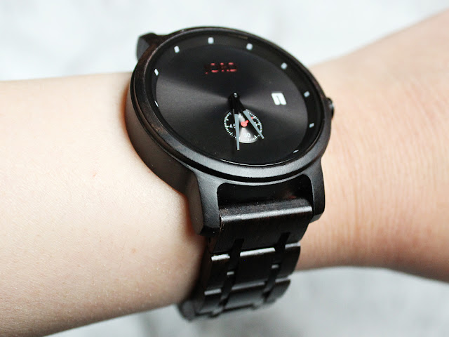 The Hyde is technically a men’s watch, but I have always been attracted to more masculine designs and I think this is a pretty unisex design. The band is made with ebony wood and the face has sapphire crystal glass and metal tipped hands. The case width is 43 mm, case thickness is 12 mm, and the band length is 150 mm. When I ordered my watch I was asked for my wrist size, and the watch fit perfectly on arrival.
