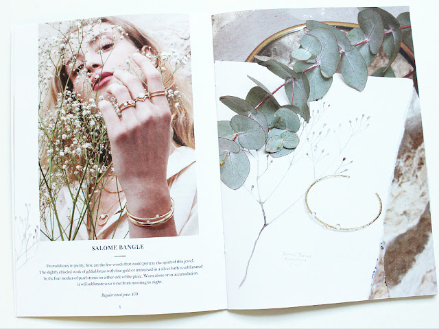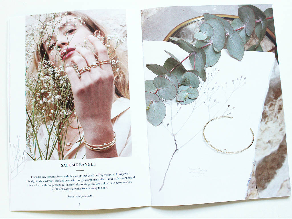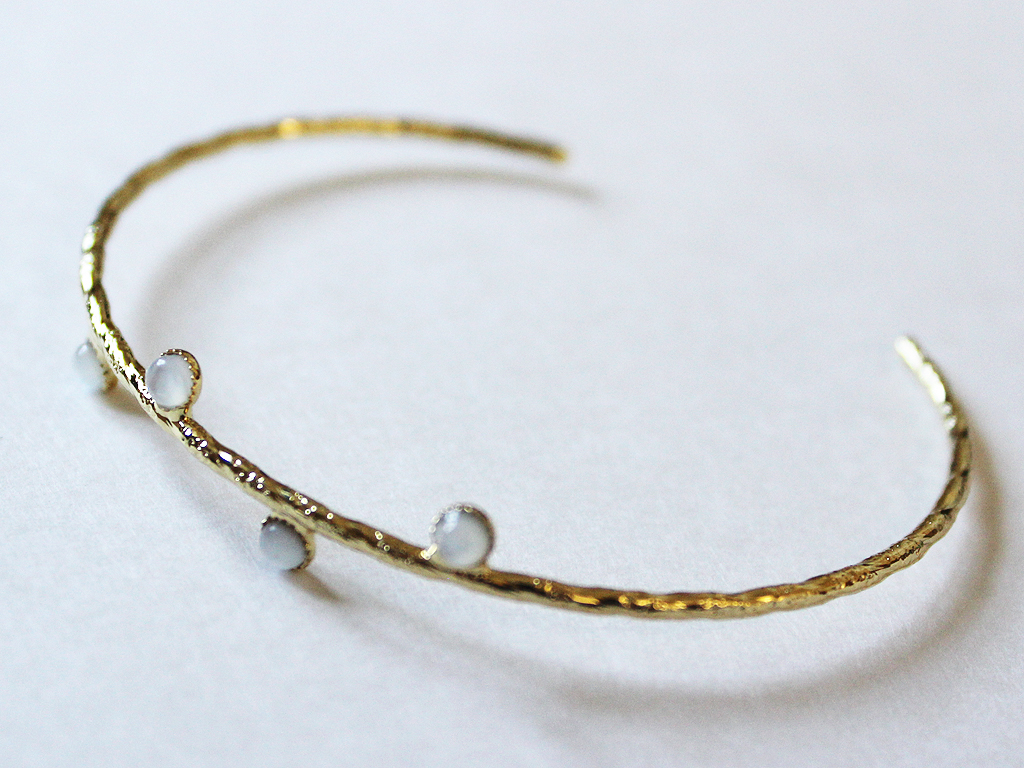 The Salome bangle is so beautiful! It’s made with gilded brass with fine gold (or immersed in silver, if you choose that style) with four mother of pearl stones on either side of the piece. It’s great for morning or night looks and is lovely alone or paired with other bracelets.