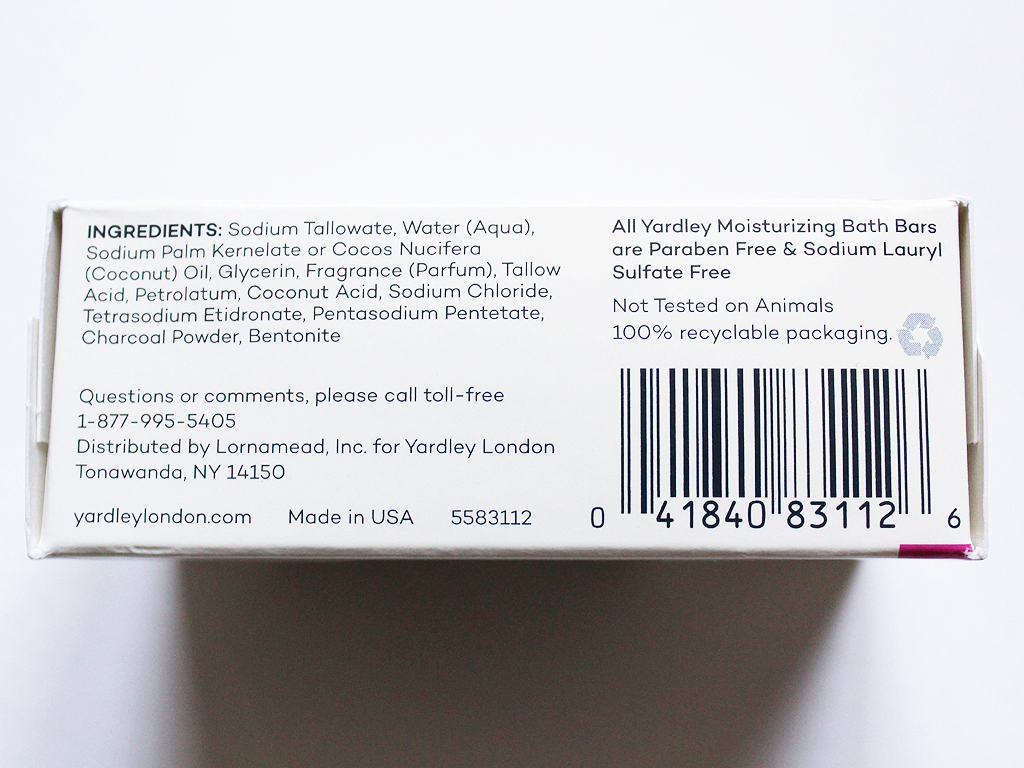 You can see the ingredients list in the photo above. All of the Yardley London bars are paraben- and sodium lauryl sulfate (SLS)-free and are not tested on animals.