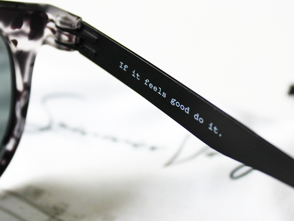 The arms of the glasses also have the style name and “If it feels good, do it” written on the insides, which I think is a fun addition to the design. The arms are sturdy, but I found that when I first unfolded them they had a little bit of resistance, so I was afraid I was going to snap them (no worries, though, the frames are well made, I was just being extra cautious).