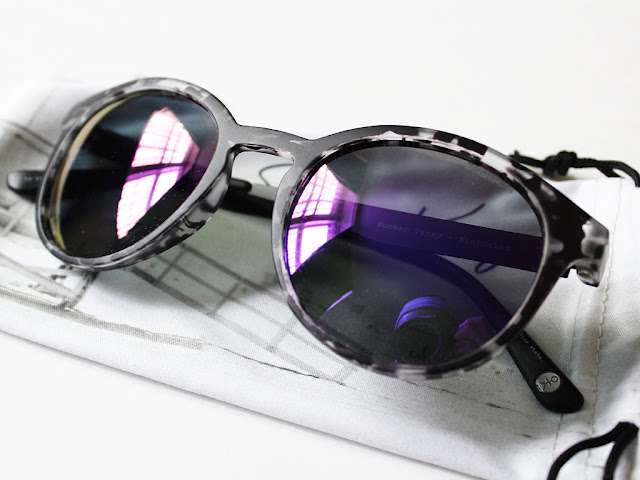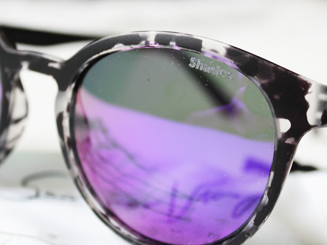 I’m not quite sure what to call this style, as they’re kind of wayfarers but have round lenses. The frames are a speckled black and white/clear pattern and the lenses are a purple/blue tint. You can see the branded “Shades” logo in the left hand lens in the photo above.