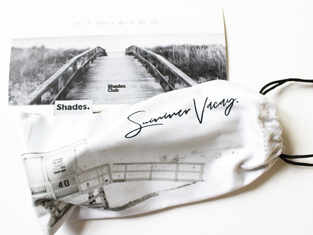 The Shades for April are the Nantucket Summer Vacay style. Each pair comes with a microfiber drawstring bag for storage that doubles as a lens cloth. Boxes sometimes also include extras, like a sunglass hanging kit. Your first box will come with the Shades branded fold up case (see that here).