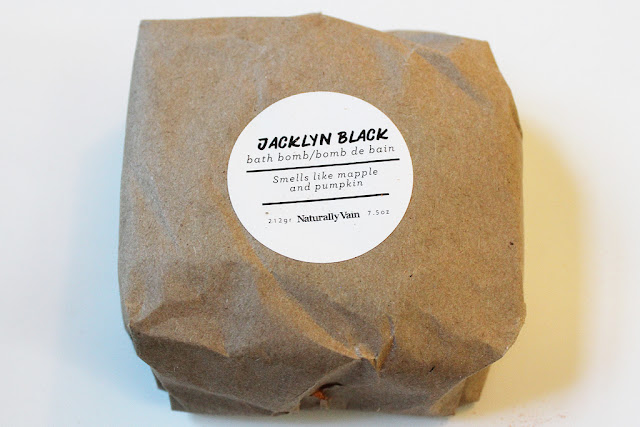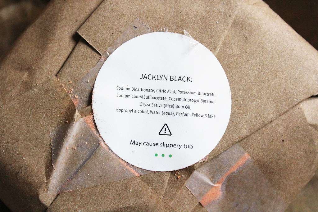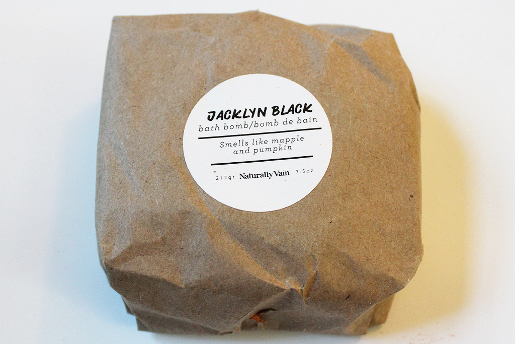 Last up is the Jacklyn Black Bath Bomb by Naturally Vain, who unfortunately didn’t fare well in transit! I don’t blame Spiral Rain, as the bath bomb was well-packaged, but making the trip from Quebec to New York must’ve roughed it up a little.