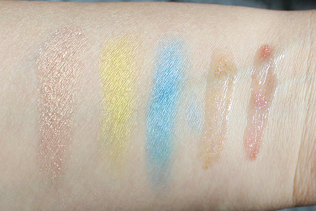 Swatched from left to right: Glo-Lite Strobe Highlighter, Moonwalk Space Dust eyeshadow, Life on Mars Space Dust eyeshadow, Barefoot Glitter Gloss, and Bankroll Glitter Gloss.