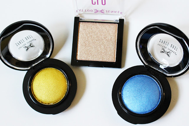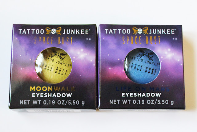 Tattoo Junkee also has powder eyeshadows. The Space Dust Moonwalk and Life on Mars shadows ($5.99 each) are gorgeous! The shadow is sponge-y to the touch and is highly pigmented. These two shades have a slight glisten to them, too.