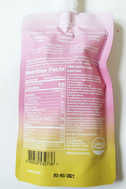 The Essential C’s Konjac Jelly were new to me, but I found they’re a popular weight-loss supplement in Korea. They’re a low calorie substitute for sugary snacks and are peach flavored. They’re made from naturally-derived konjac in jelly form, which aids in weight management and satiety. It is fat free and has 10 calories per pouch. You can get an individual pack for $3 or a box of 10 for $30.