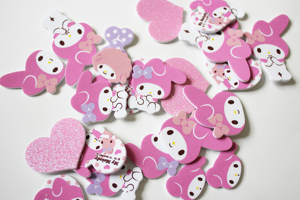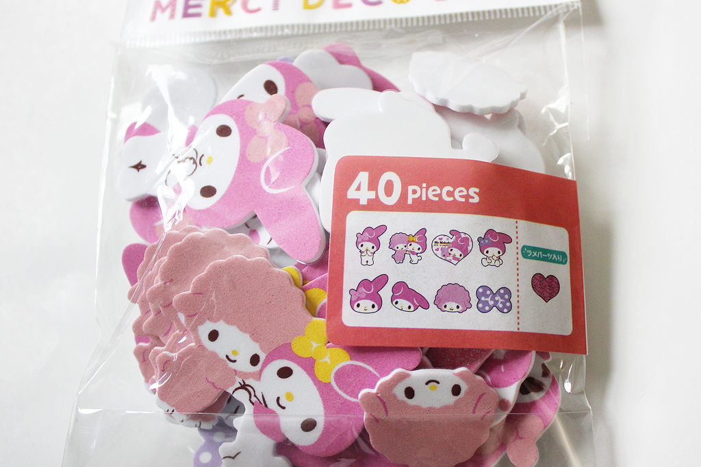 My Melody is a Sanrio character an I’ve always liked her because she’s a little pink bunny. The My Melody Soft Sponge Stickers came in a set of different poses with shiny hearts and other characters to go along with My Melody. These are great for adding to packages and presents or journal entries.