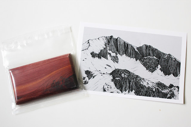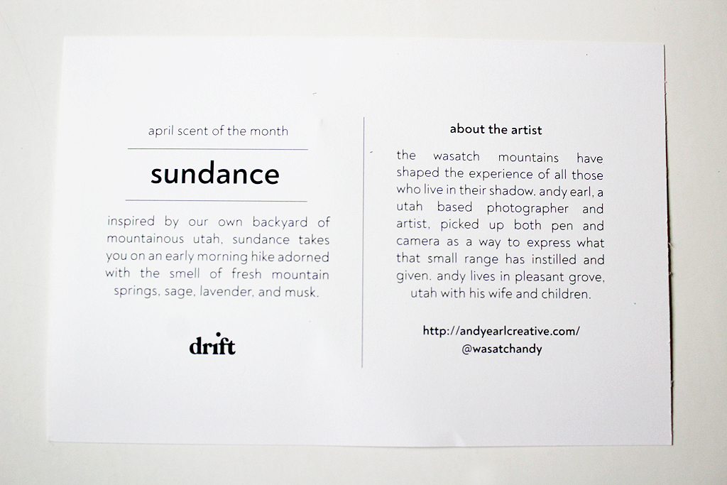 My drift(wood) replacement came wrapped in plastic to preserve the scent. The April scent was Sundance, and it has notes of mountain springs, sage, lavender, and musk. The info card says it was inspired by the mountains of Utah where drift is headquartered. There’s also information about the artist who created the print on the other side of the card.