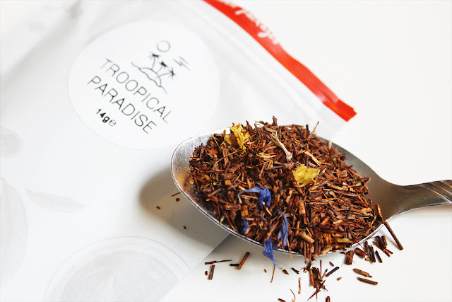 The Troopical Paradise tea is absolutely gorgeous! This is a rooibos blend with passionfruit and other fresh exotic ingredients. It’s from the Klipopmekar rooibos farm in northern Cederberg mountain range in South Africa. They produce top quality, ethically grown organic rooibos teas in an environmentally sustainable manner. I loved the delicious, fruity flavor in this one.