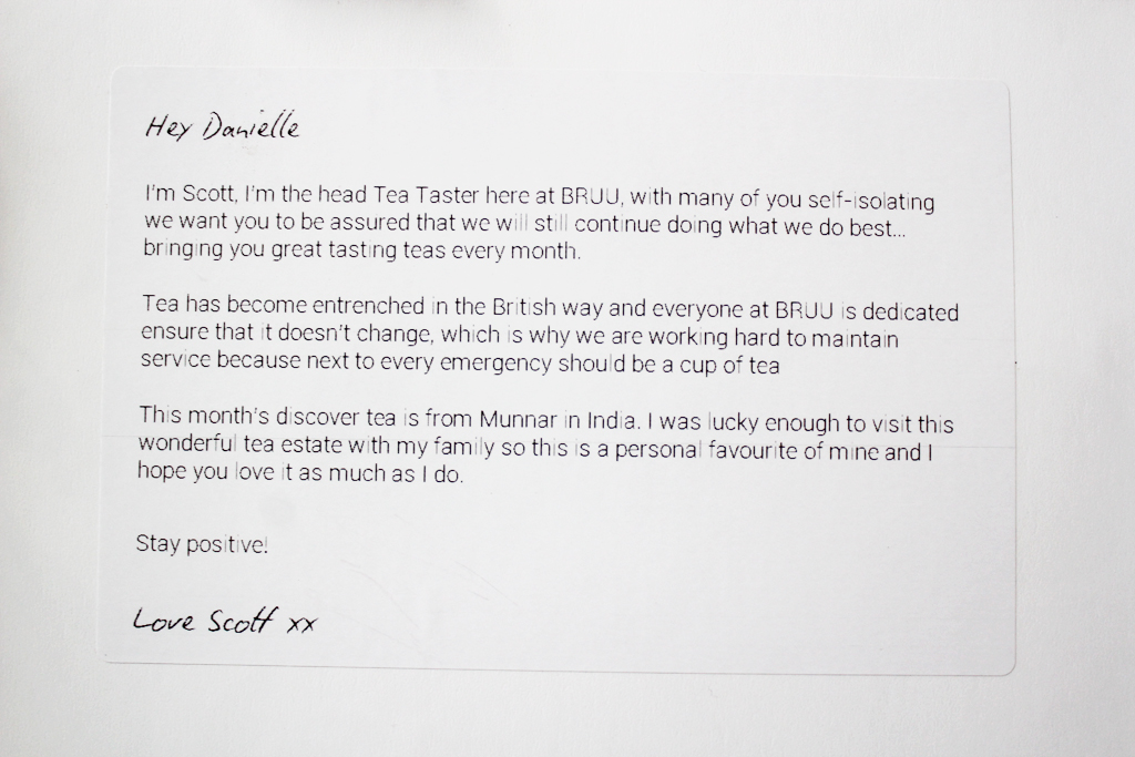This month, the BRUU team visited of Munnar in the Surianalle region of India. The other side of the card in the first photo above had lots of information about the region and the teas.