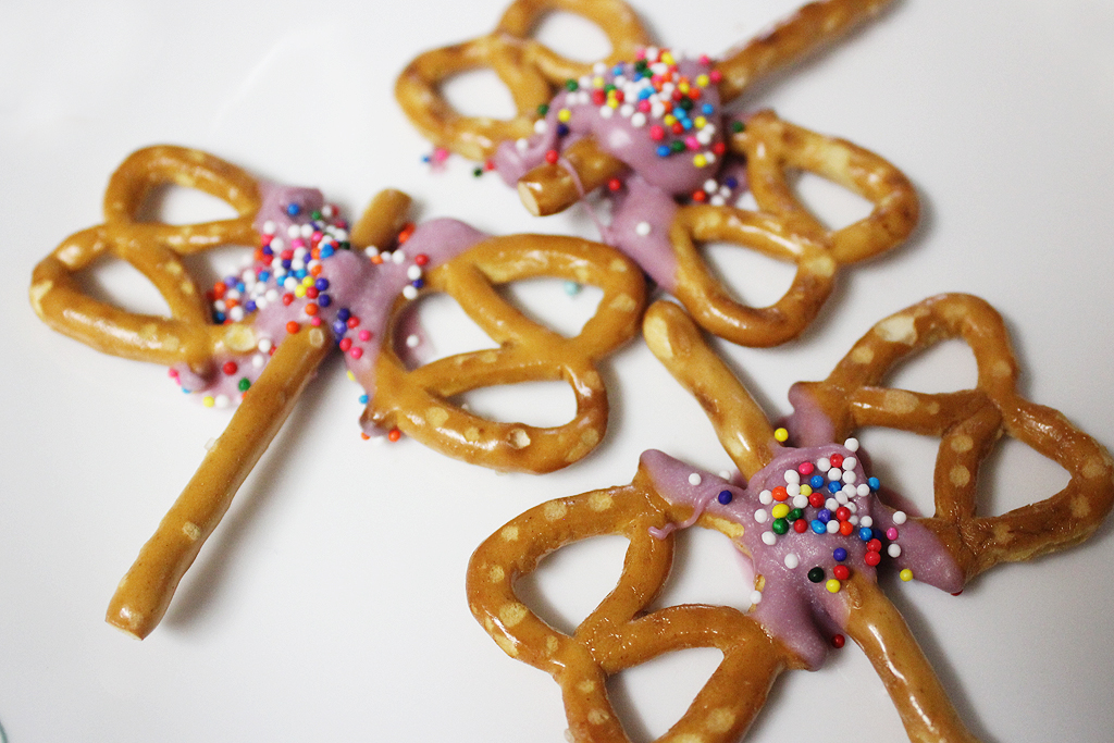 The first craft for April was Pretzel Butterflies. I mistakenly included the white sticks in the first photo, thinking they were for this project, but I was incorrect. The project included using pretzels and pretzel sticks with melting chocolate to hold them all together in a butterfly shape, plus sprinkles for a fun dash of color. I love salty/sweet snacks and these were great!