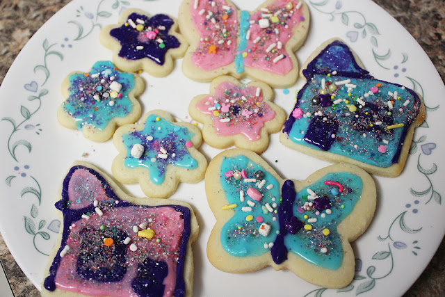 The cookie shapes for May were little flowers, butterflies, and houses with pink, blue, and purple frosting and multicolored sprinkles. As you can see, I didn’t do a great job of decorating the houses, but I did have a lot of fun with the sprinkles!