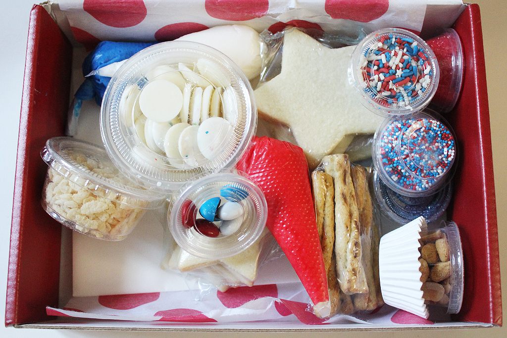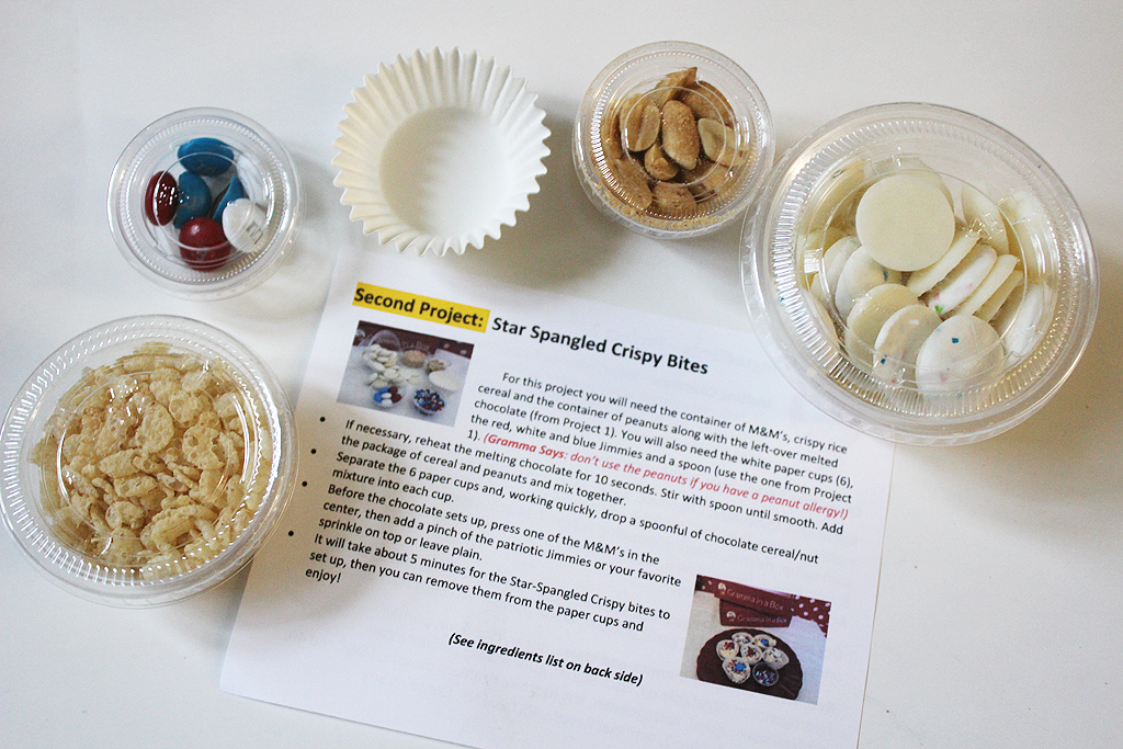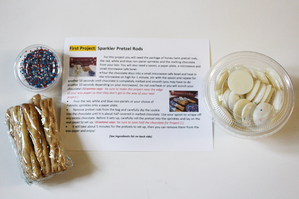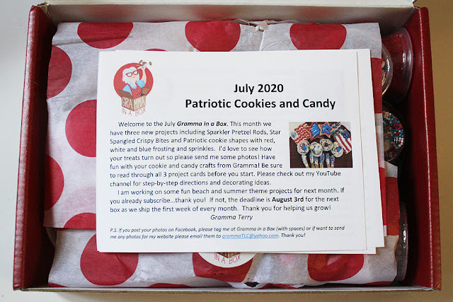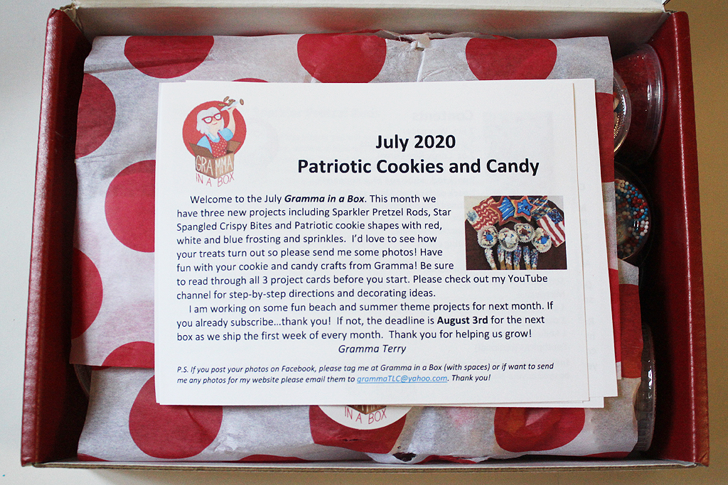 The July Gramma In a Box was all about patriotic treats for the 4th of July! As always, the box was full of yummy ingredients to create cookie and candy crafts.