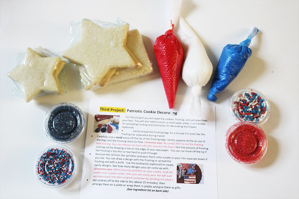 The box always contains cookie decorating, and the Patriotic Cookie Decorating was the theme for July. The cookies are pre-made and wrapped in plastic shrink wrap to keep them fresh. It’s recommended that you complete the crafts within a week of receiving the box to ensure freshness.
