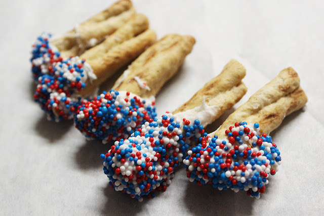 The first project is Sparkler Pretzel Rods. I melted the chocolate discs in the microwave and then dipped the pretzels into the chocolate and sprinkles for a fun firecracker-like design.