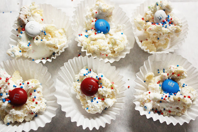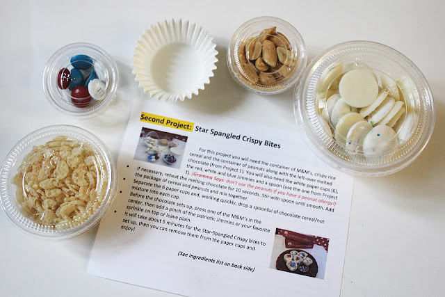 The second project was Star Spangled Crispy Bites and used the rest of the melted chocolate. The puffed cereal was mixed in and spooned into the little paper holders, then I added an M&M and some sprinkles on top.