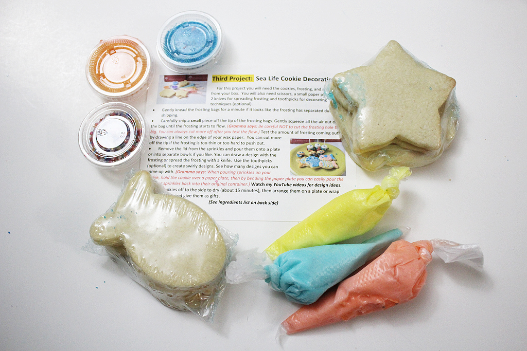 The third project is always cookies, and the August were Sea Life Cookies. There were eight cookies total, with three frosting colors and lots of different sprinkles. The cookies are pre-baked and plastic wrapped and I’ve never gotten them in any state other than completely fresh. It’s recommended that you complete the crafts within a week of getting your box to make sure they stay fresh, though.
