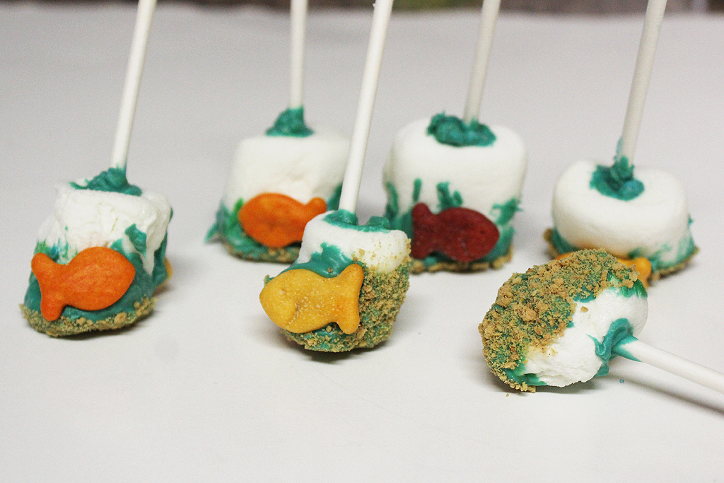 The first craft was Baby Shark Pops! So cute. To make them, I melted the chocolate discs in the microwave and dipped the sticks into the chocolate, put the stick into the marshmallow, and then rolled them in the graham cracker crumbs. There were enough marshmallows to make six pops, though some of mine got a little melted due to the heat during transit, so a few were smaller than the others. This didn’t bother me, though. The last step was to add the Goldfish crackers on the sides.