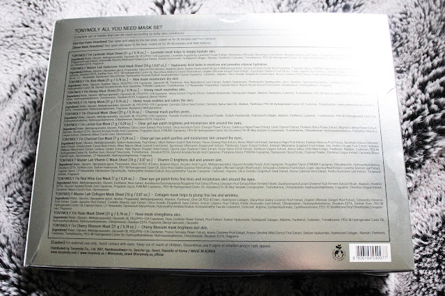 The back of the box lists all of the masks and their ingredients (click the photo to view larger). There are 10 face masks and three under eye masks.