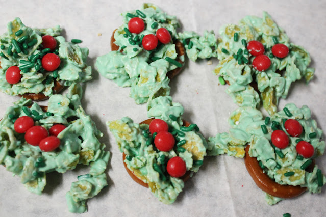 The second craft, Holiday Wreaths, used the rest of the melting chocolate. I added in the green discs to the already melted white chocolate, then mixed in the cornflake cereal. The mixture was then spooned onto a pretzel ring base and decorated with green sprinkles and red hot candies.