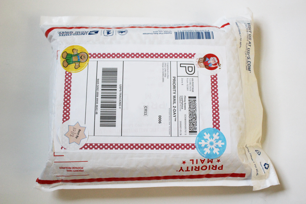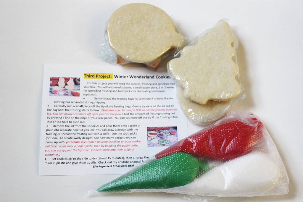The third craft is always cookies. The cookies are pre-baked and vacuum sealed, but it’s still best to do your crafts within a week of receiving the box so that they’re at their freshest. The December cookies were a Winter Cookies theme and had ornament, snowflake, snowman, and tree shapes. Red, white, and green frosting and various sprinkles were included for decoration.